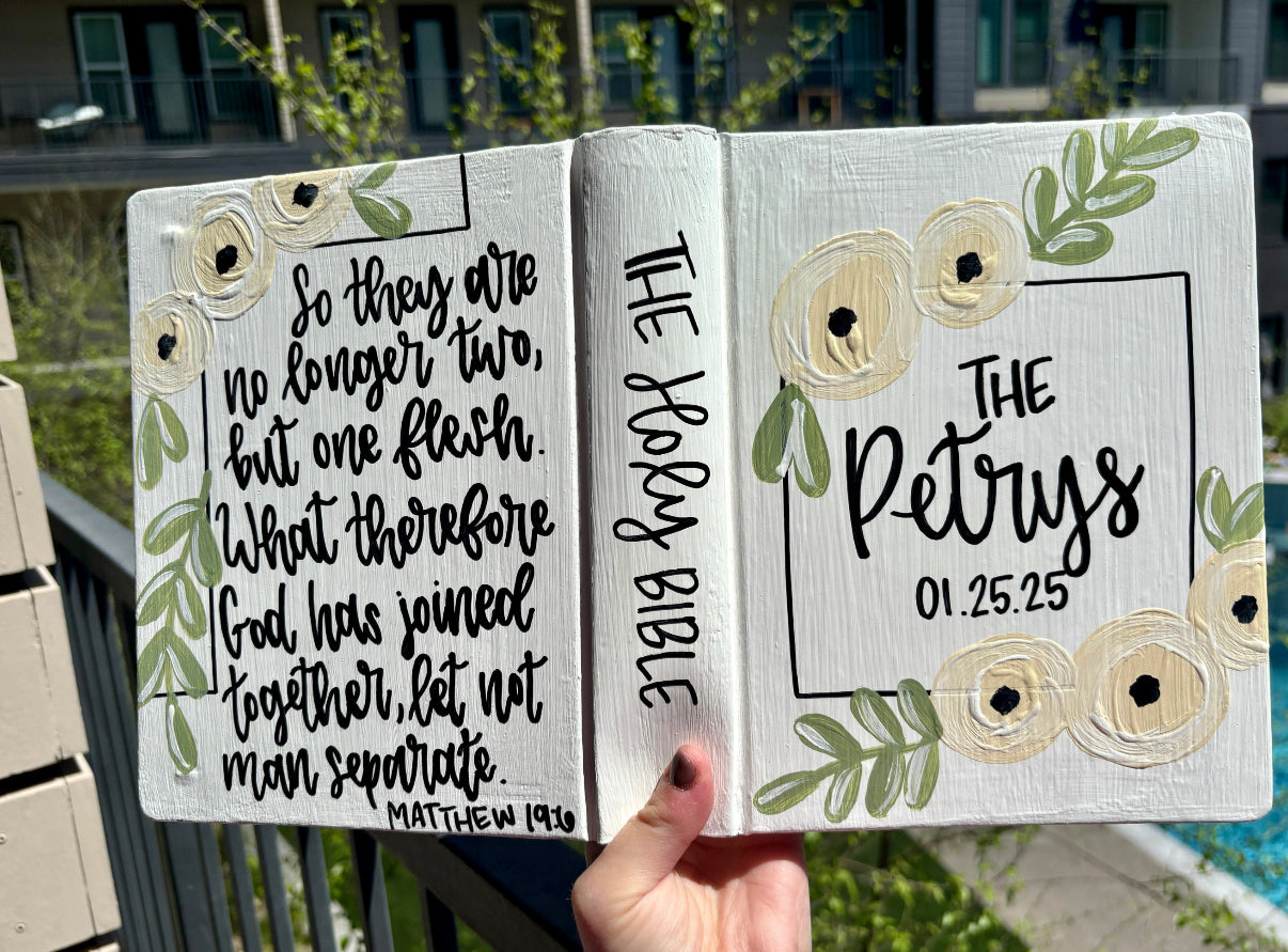 These are great wedding gifts, Christmas gifts, birthday gifts, etc. A Bible is a gift that will last a lifetime. Even better, a hand-painted Bible puts a personal touch on such a heartfelt gift. Each Bible is painted by me, and made to order. They are also sealed to prevent scratches. They are all prayed over, and carefully painted with you in mind.