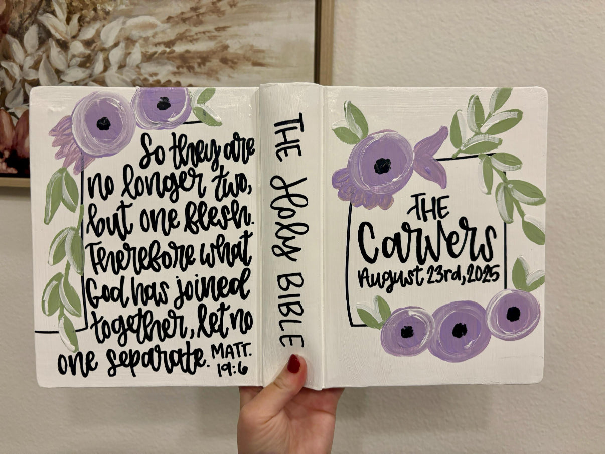 These are great wedding gifts, Christmas gifts, birthday gifts, etc. A Bible is a gift that will last a lifetime. Even better, a hand-painted Bible puts a personal touch on such a heartfelt gift. Each Bible is painted by me, and made to order. They are also sealed to prevent scratches. They are all prayed over, and carefully painted with you in mind.